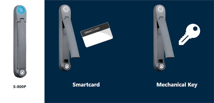 S-800 handle allows 2 lock releasing ways – by SmartCard or Mechanical key. In the event of failure in the smartcard or handle electronic board, the handle lock can still be released by mechanical key. Under normal operation handle release by mechanical key is not recommended