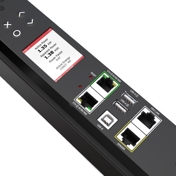 Using the PDU Link Port with a standard Cat5 connection, provides active redundant power to a second like-designed and versioned PDU controller, maintaining sensor connection and network visibility in case of an outage.