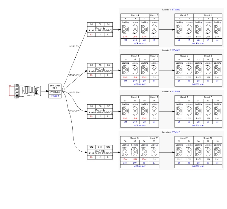 380-415V, 3Φ, 60/63A, 31.6-34.5kVA 3PH, 400/415V, 63A or 48A (derated), 36 Outlets: 36 x Locking HDOT Cx, Input: IEC 60309 3P+N+E, 0U, 34.5/43.1kVA, 12 x 10kAIC breakers, Outlet Metered/Switched