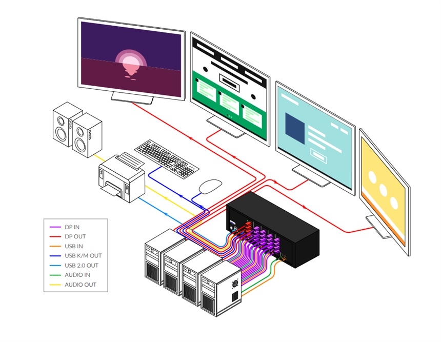 Quad Head 4-Port UHD 4k@60 DP KVM Switch with Edid Aux Emulation.
