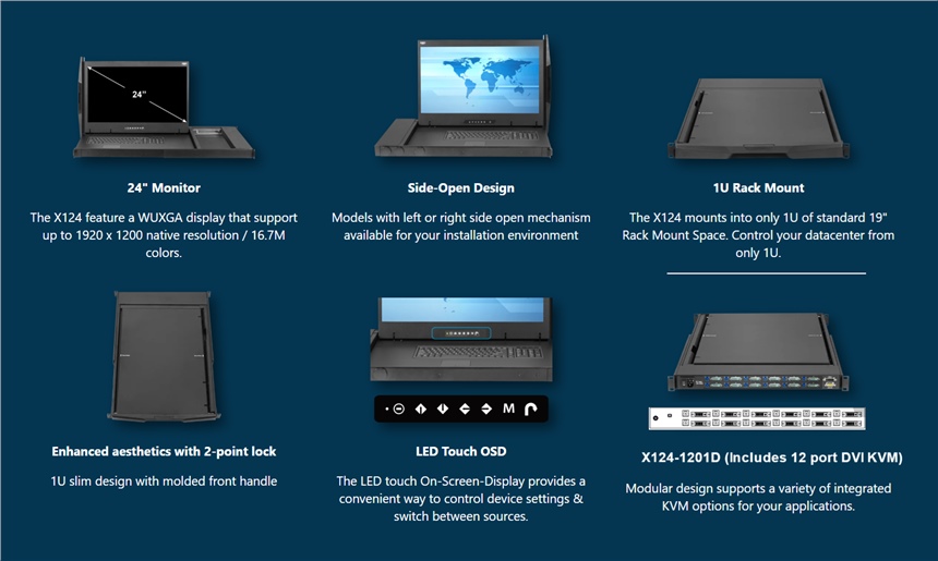 X124-1201D - Austin Hughes - 1U 24″ WUXGA LED-backlit LCD Console Drawer, CyberView X124 Rack Drawer, 1920 x 1200 Video