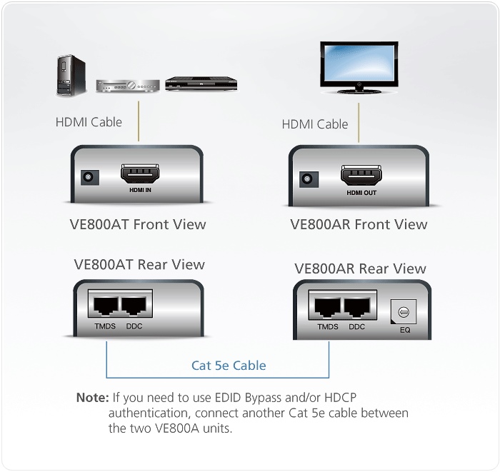 The VE800A HDMI Extender extends your HDMI display up to 60 m away from your HDMI source using one Cat 5e cable. ATEN’s VE800A incorporates new technology that allows the A/V signals to be transmitted over a single Cat 5e cable. DDC port is provided for the ability to use the display’s EDID by simply connecting another Cat 5e cable. The VE800A supports HDMI features such as 3D and Deep Color to give you the picture perfect viewing experience you desire.