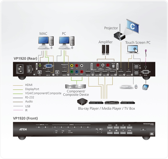 The ATEN VP1920 is a 3-in-1 presentation switch that integrates a video matrix switch, an audio processor, and analog-to-digital converter functions. With nine multi-format inputs to two HDMI 4K outputs, it is designed to boost the efficiency and impact of professional presentations. With streamlined control from front panel pushbuttons, IR remote controller, OSD, and RS-232, the VP1920 reduces not only system device count, but also lower operation complexity. It is suitable for all small-to-medium sized corporate and education presentation environments, such as meeting rooms, classrooms, training rooms, or any other presentation setting, such as in exhibitions or hotels...